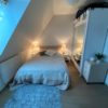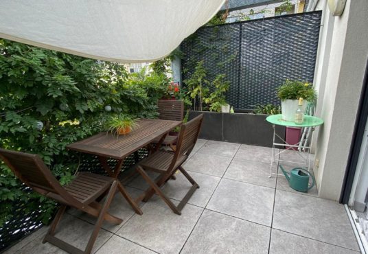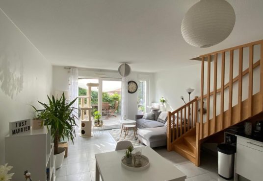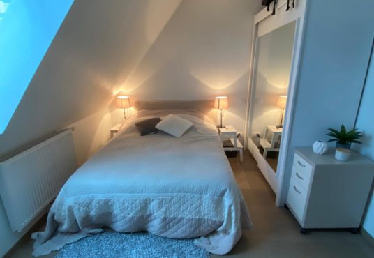 Cet appartement traversant et légèrement mansardé se compose au 1er niveau d’une entrée avec placard aménagé, un salon-séjour de 26,43 m² avec belle cuisine américaine équipée (meubles, hotte, 4 plaques vitro, four, frigo/congélateur) donnant accès à une terrasse exposée ouest, une salle d’eau avec WC.